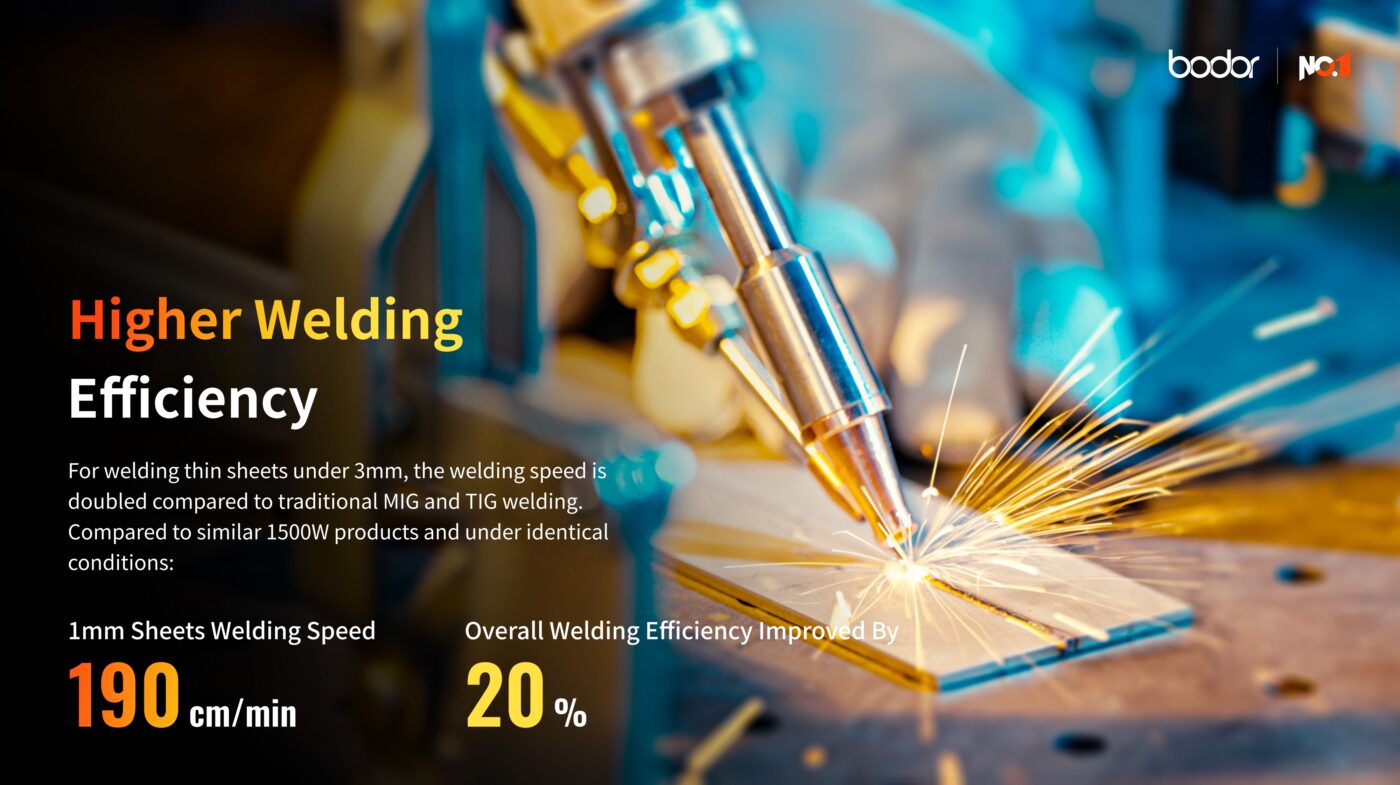 - Higher Welding Efficiency — For thin sheets under 3mm, welding speed is doubled compared to traditional MIG/TIG. 1mm sheets reach 190 cm/min; overall efficiency improved by 20%.